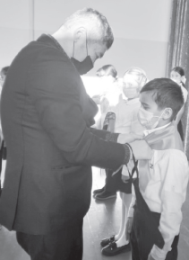 Ұйымға қабылданған оқушылардың мойнына ұйымның рәмізі - көк галстукты мектеп директоры Қанат Шайхсламұлы, Достық үйінің басшысы Зәуреш Қонақбаева, қалалық «Ана ұлағаты» қоғамдық бірлестігінің төрайымы Маруаш Сағындықова, «Світанок» украин этномәдени бірлестігінің төрайымы Любовь Синько және «Беларусь» белорус этномәдени бірлестігінің төраға орынбасары Анатолий Дворак тақты. Айтқандайын, мектеп Достық үйімен ынтымақтастықта «Этно микс» жобасын жүзеге асырып келеді.